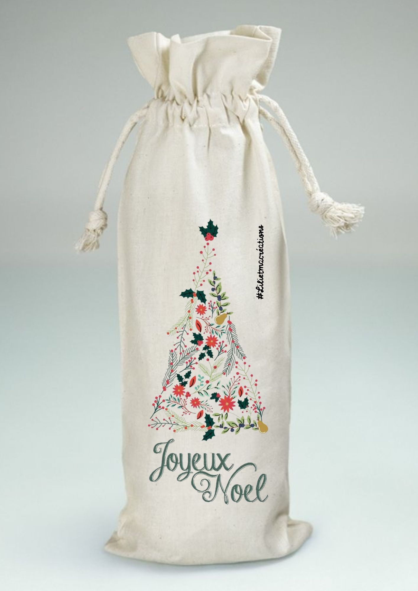 Sac à bouteille beige en coton biologique imprimé thermocollé "Joyeux Noël "