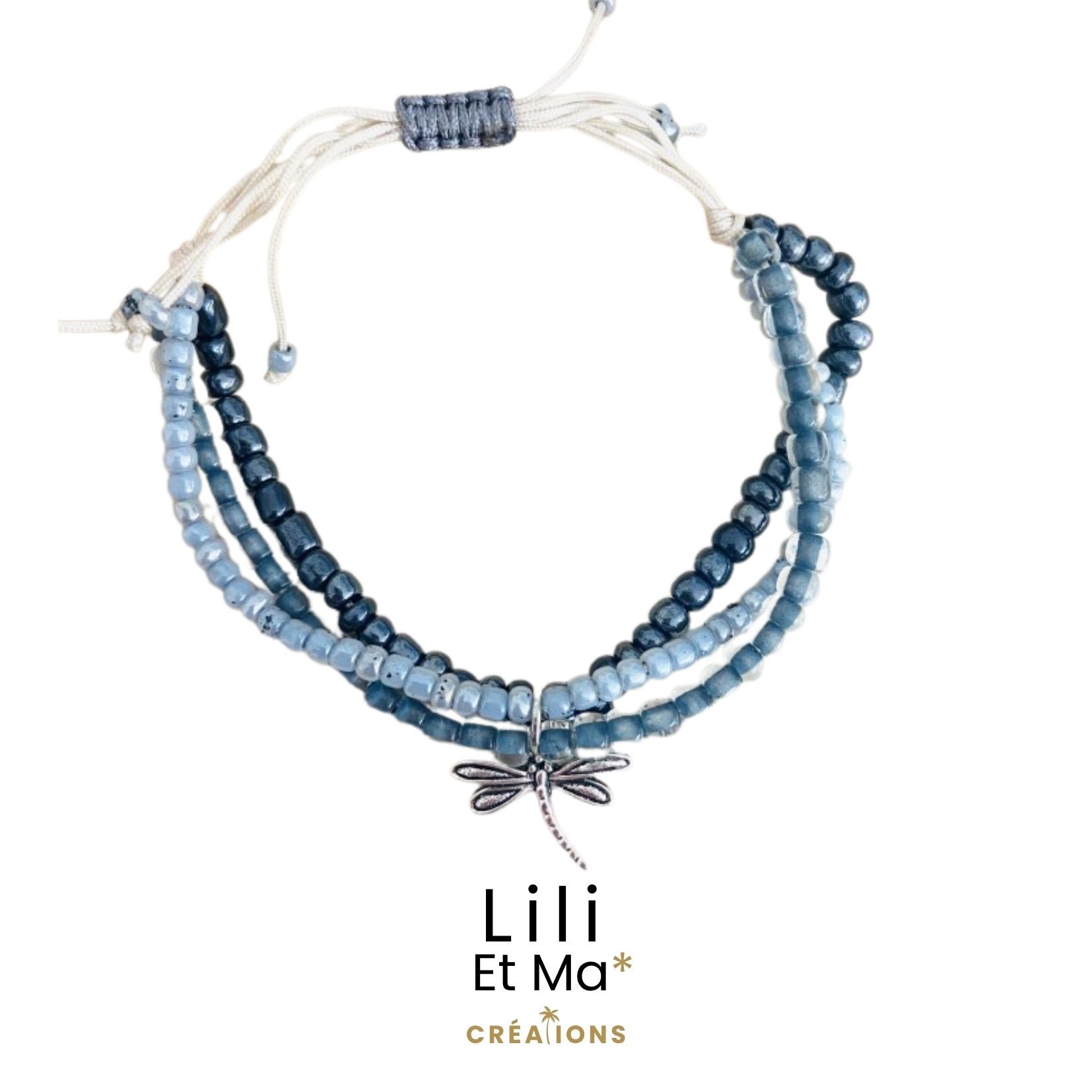 Ce bracelet artisanal est composé de trois rangs de perles de rocaille aux teintes grises , montées sur un cordon réglable beige. Une libellule en métal argenté ajoutent une touche unique.