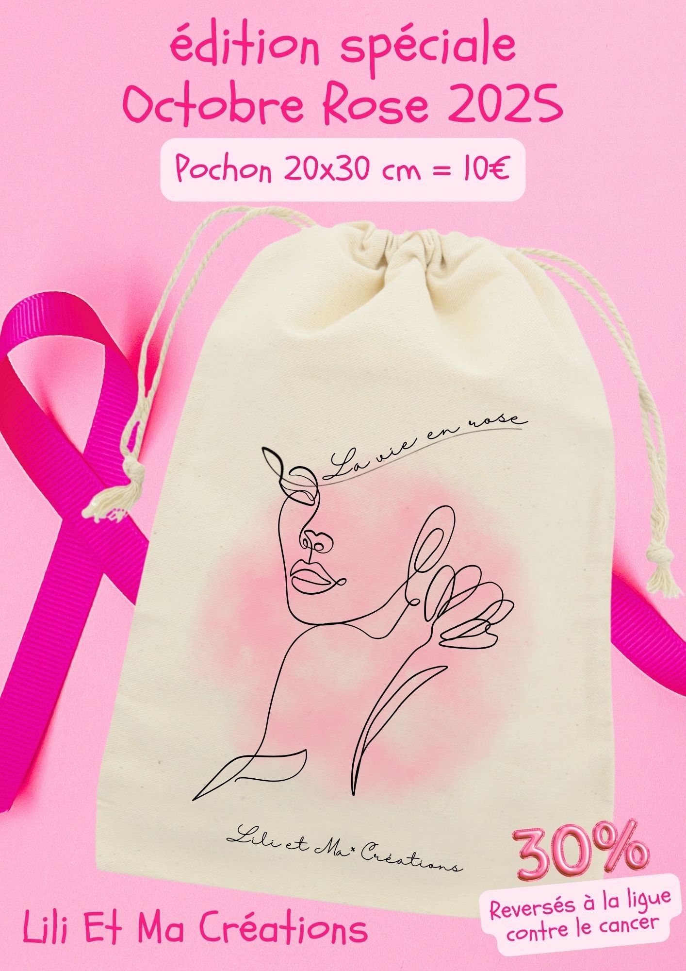 Les totes bag et pochons OCTOBRE ROSE sont vendus au profit de la luttte contre le cancer du sein.