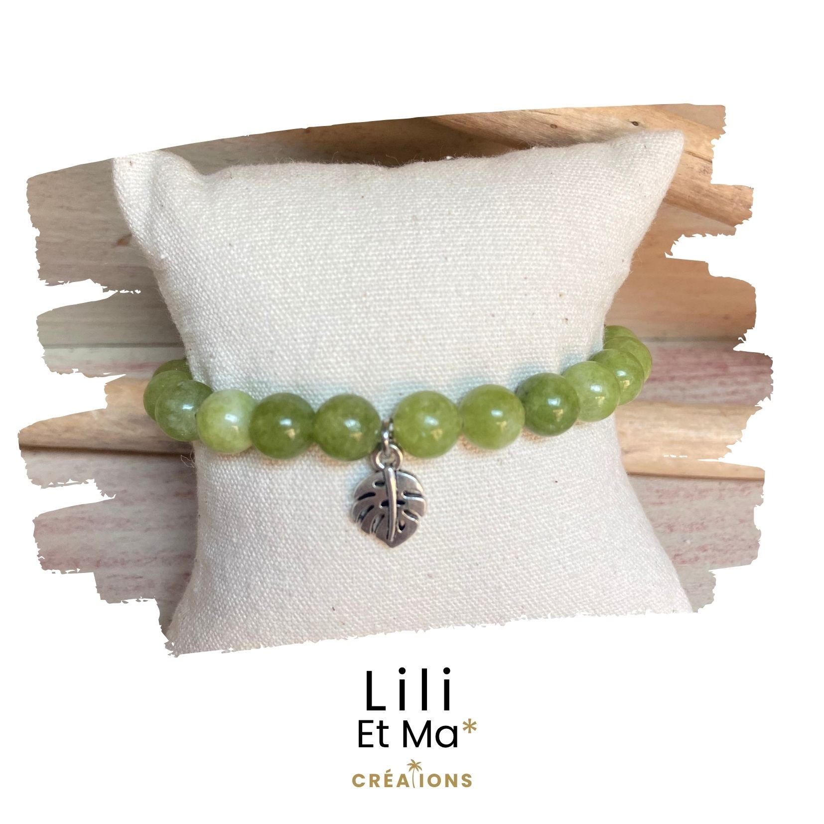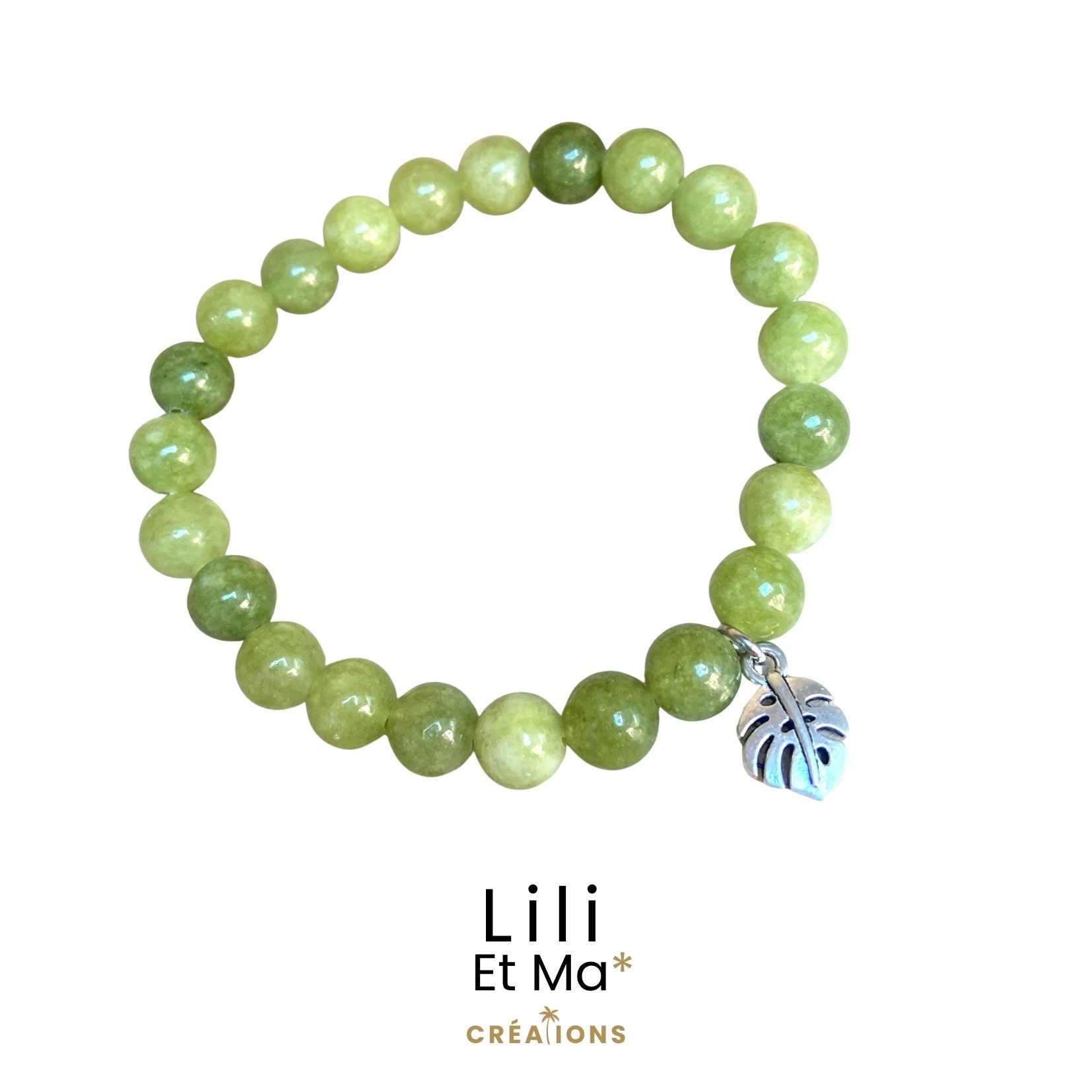 Bracelet jade vert pierres naturelles, feuille argentées.