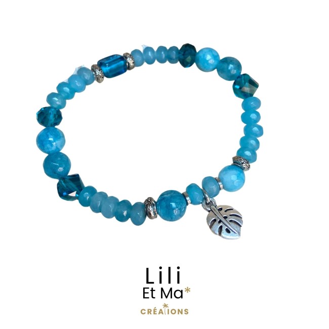 Bracelet agate bleue pierres naturelles, feuille argentées.