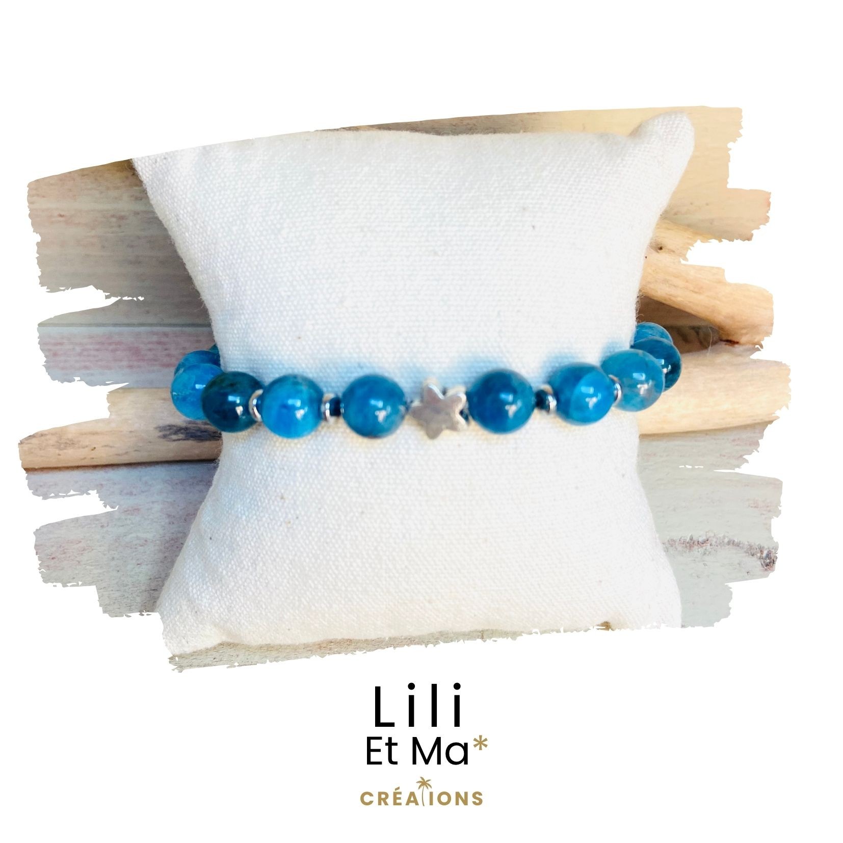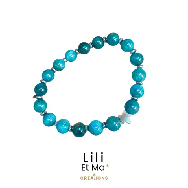 Bracelet apatite bleue pierres naturelles, étoile argentées.