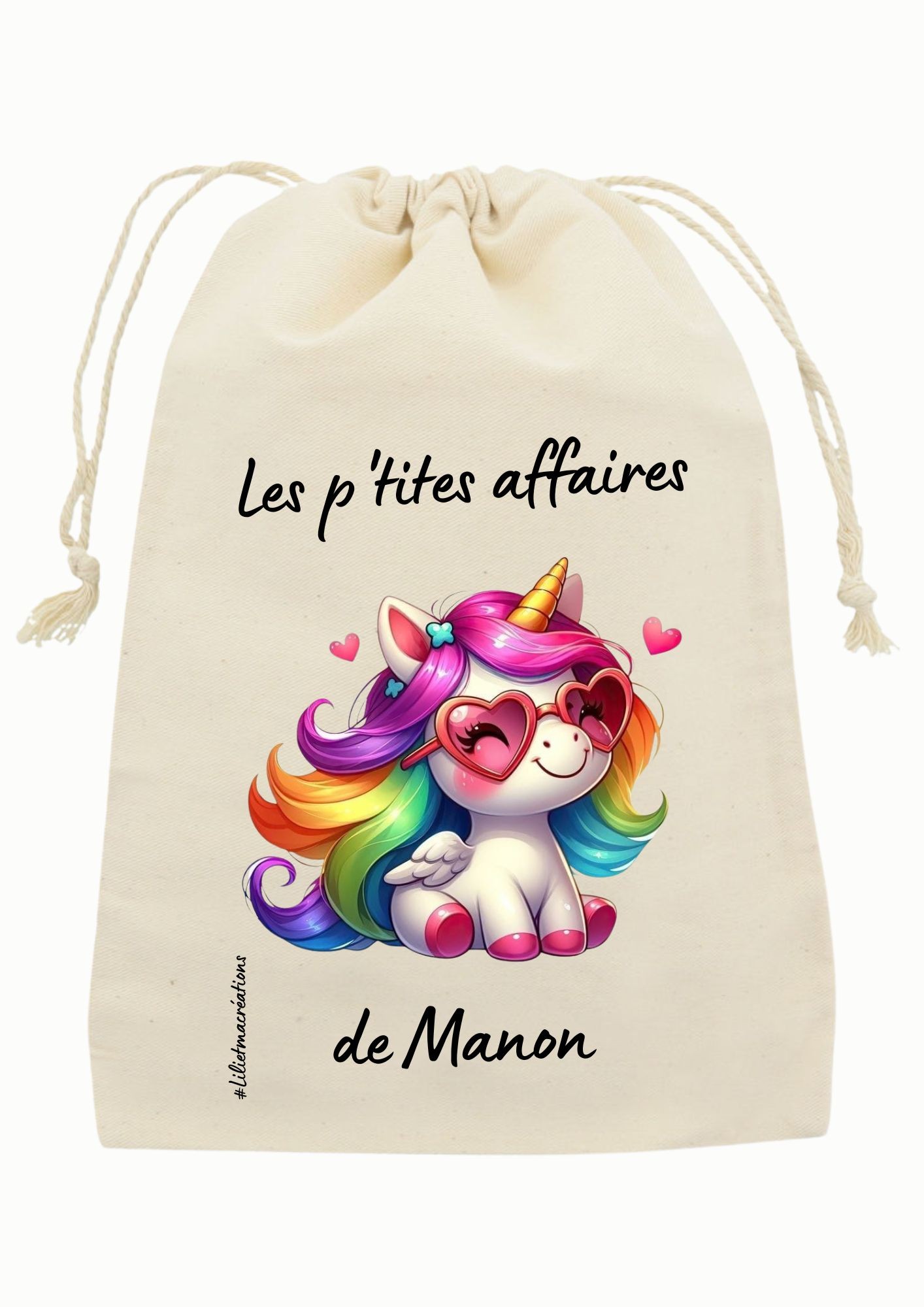 Un pochon personnalisable avec l'inscription « Les p'tites affaires de... » et un motif licorne est un cadeau idéal pour les amateurs de magie et de fantaisie. Ce sac en tissu est non seulement pratique pour ranger des petits objets personnels, mais il ajoute également une touche de charme et de personnalité. Grâce à sa personnalisation, il peut être un cadeau unique et attentionné pour un anniversaire, une fête ou toute autre occasion spéciale. Le motif licorne, symbole de rêve et d'imaginaire, ravira aussi bien les enfants que les adultes qui gardent une âme d'enfant.