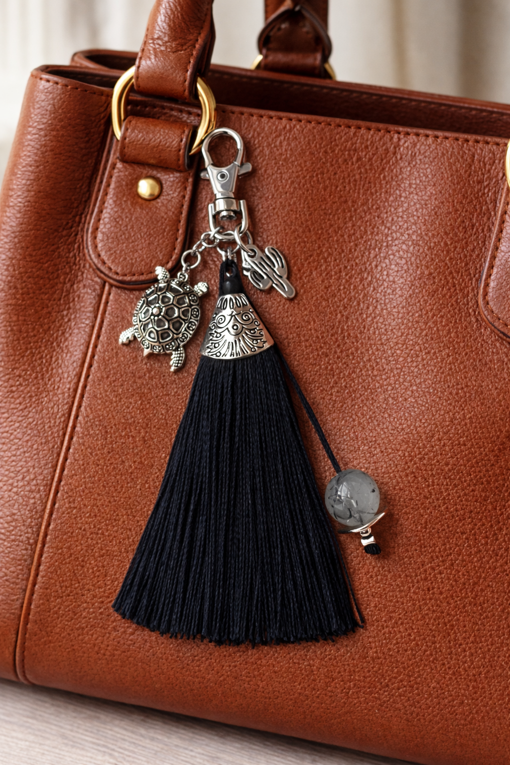 Pompom noir, perle naturelle, breloques tortue et cactus argentées (pièce unique)