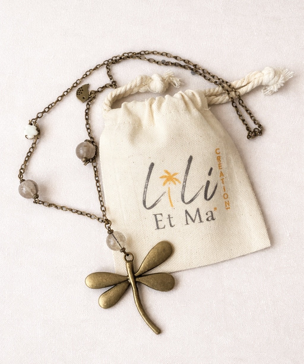 Sautoir libellule bronze, chaine bronze, perles en verre et nacre, livré dans son petit pochon en coton biologique.