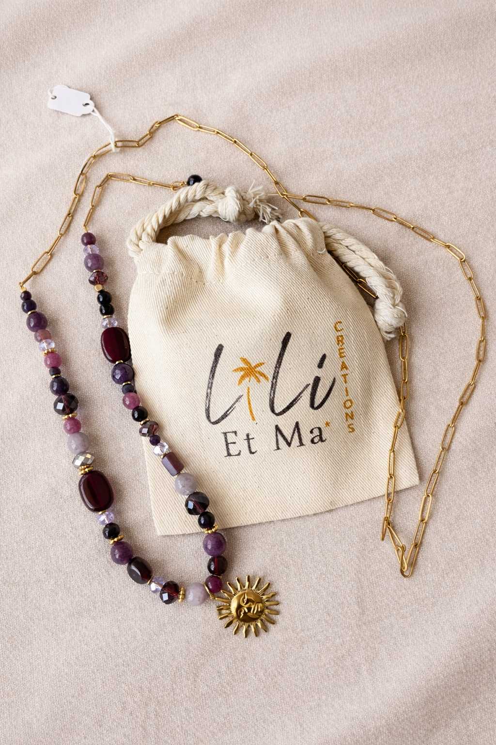 Sautoir soleil doré, perles assorties (pierre et verre) violettes sur chaine en métal argenté acier inoxydable, livré dans son petit pochon en coton biologique.