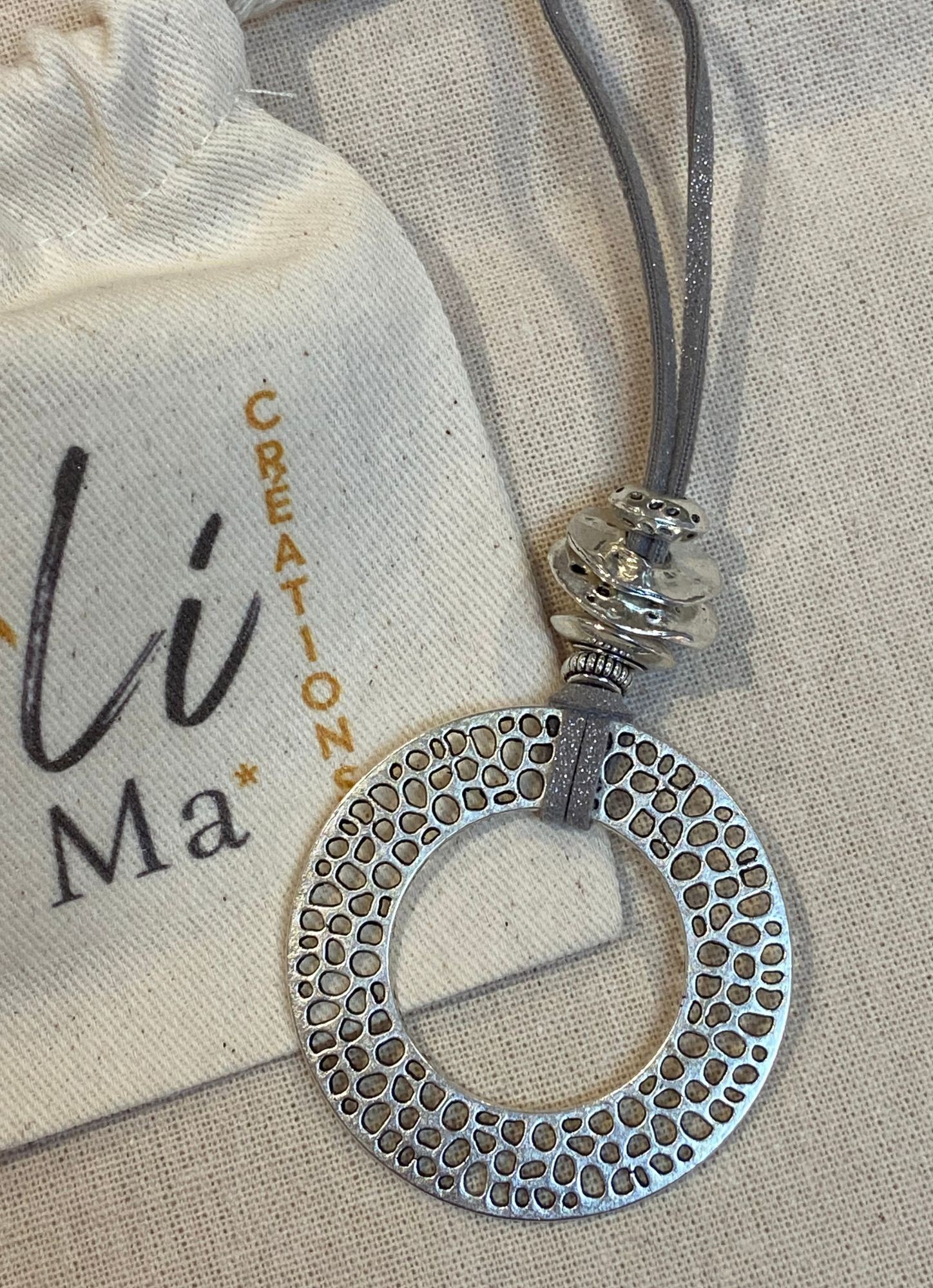 Sautoir SOLEA argenté, cordon suédine gris pailleté, perles martelées en métal argenté, livré dans son petit pochon en coton biologique.