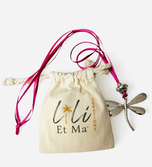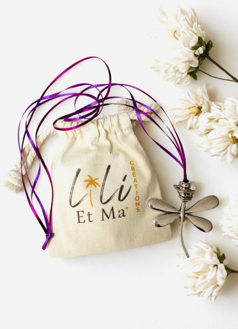 Sautoir libellule argentée, montée sur un double ruban de satin rose, livré dans son petit pochon en coton biologique.