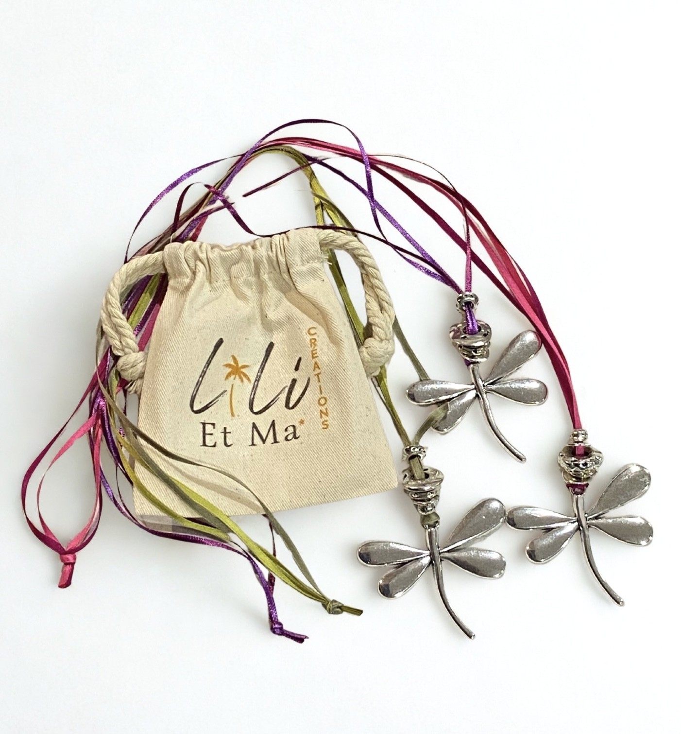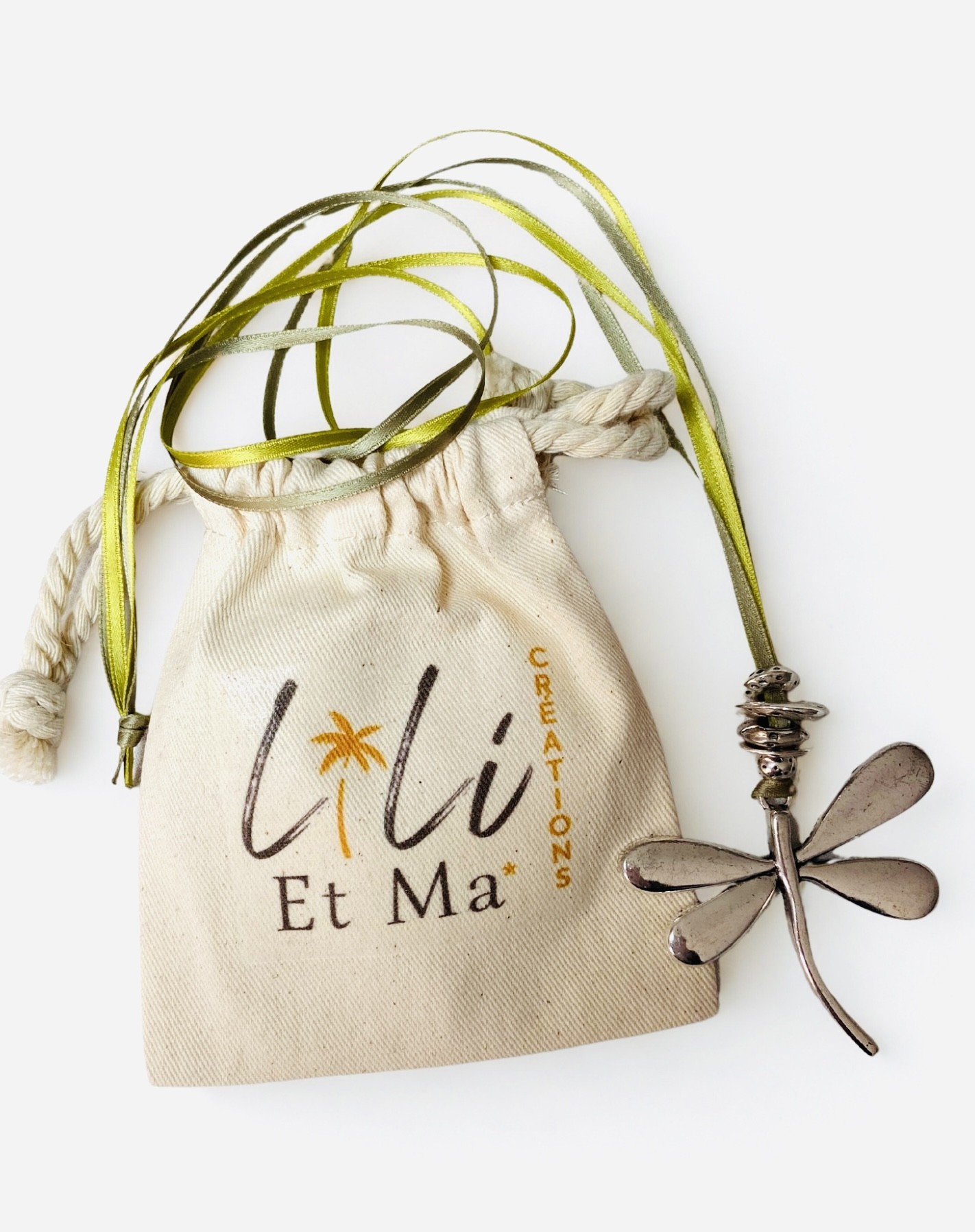 Sautoir libellule argentée, montée sur un double ruban de satin vert anis, livré dans son petit pochon en coton biologique.