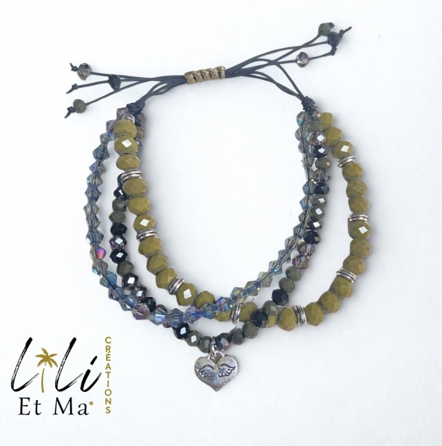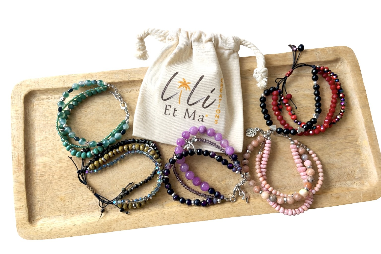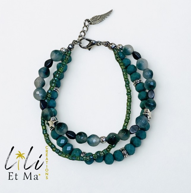 - Matériaux : perles à facette, perles naturelles, breloque métal argenté