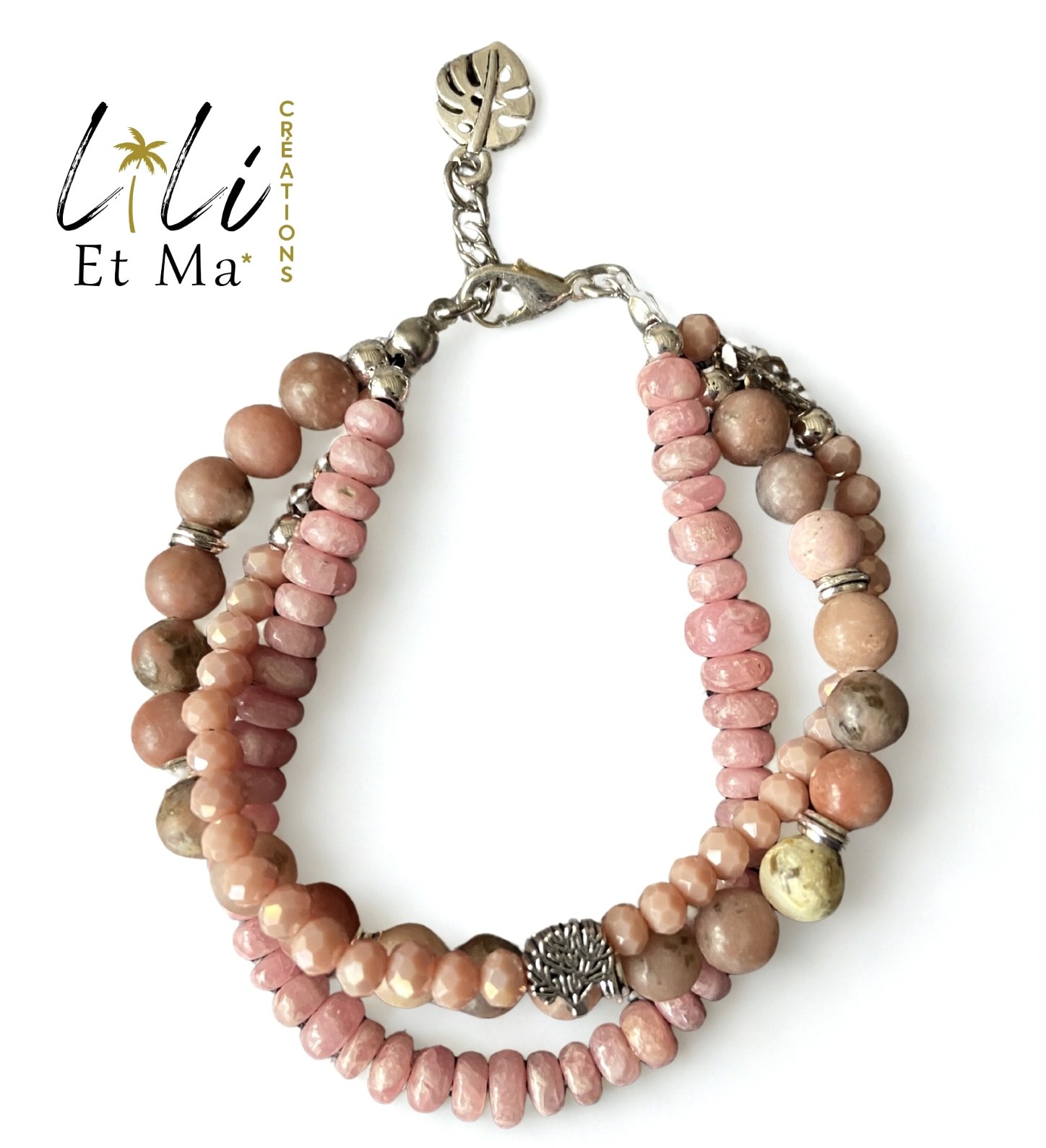 Ce bracelet artisanal est composé de trois rangs de perles naturelles Pierre de Soleil (joie de vivre, confiance en soi) aux teintes rose et de perles à facettes de différentes tailles montées armonieusement.