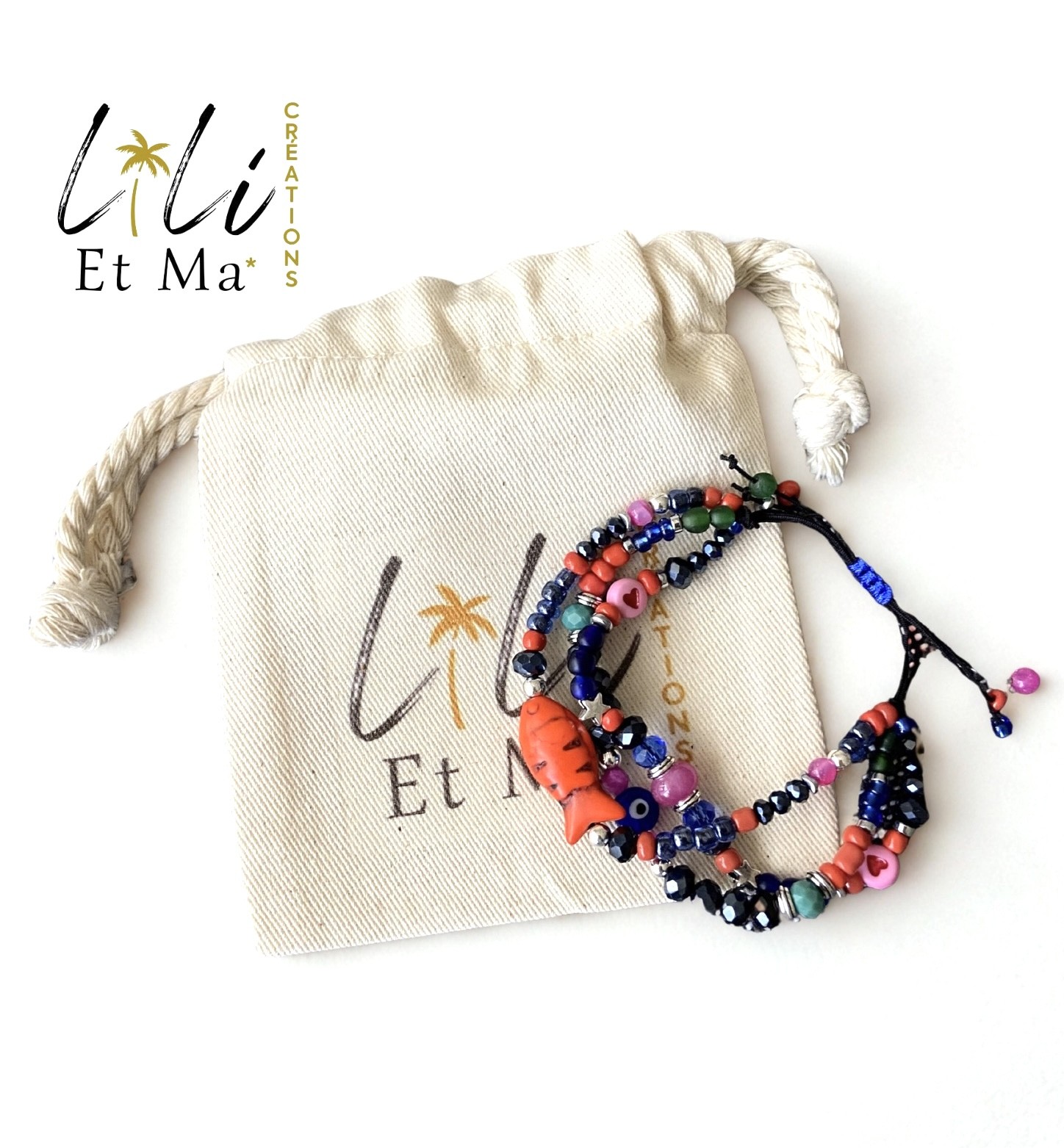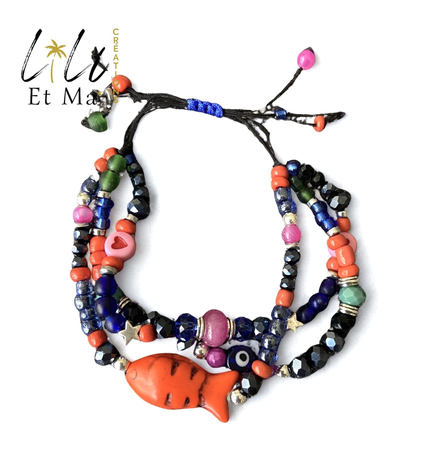 Ce bracelet artisanal est composé de trois rangs de perles de rocailles et à facettes aux teintes bcolorées de différentes tailles montées armonieusement, avec au centre un joli poisson orange.