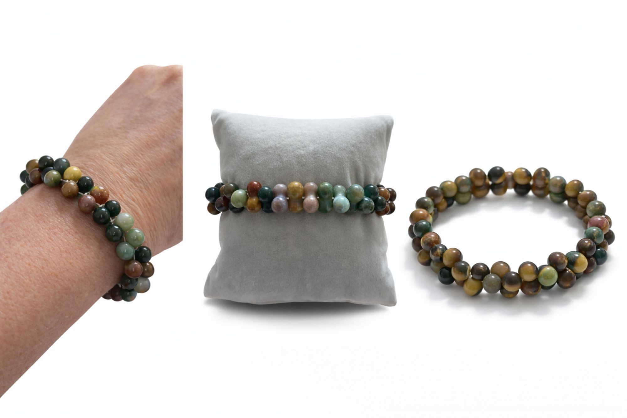 Ce bracelet est composé de pierres naturelles d’agate indienne, reconnaissables à leurs magnifiques nuances de vert, brun, beige et parfois rosé. Chaque perle possède des variations naturelles qui rendent chaque bracelet unique.