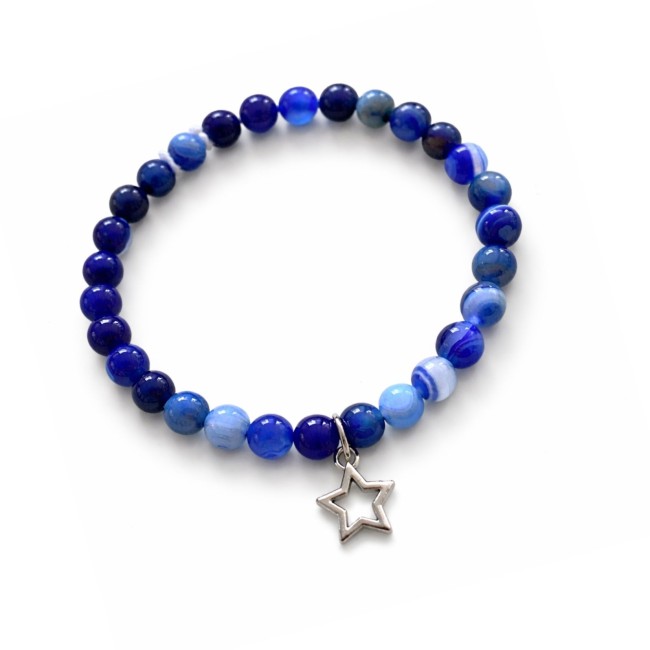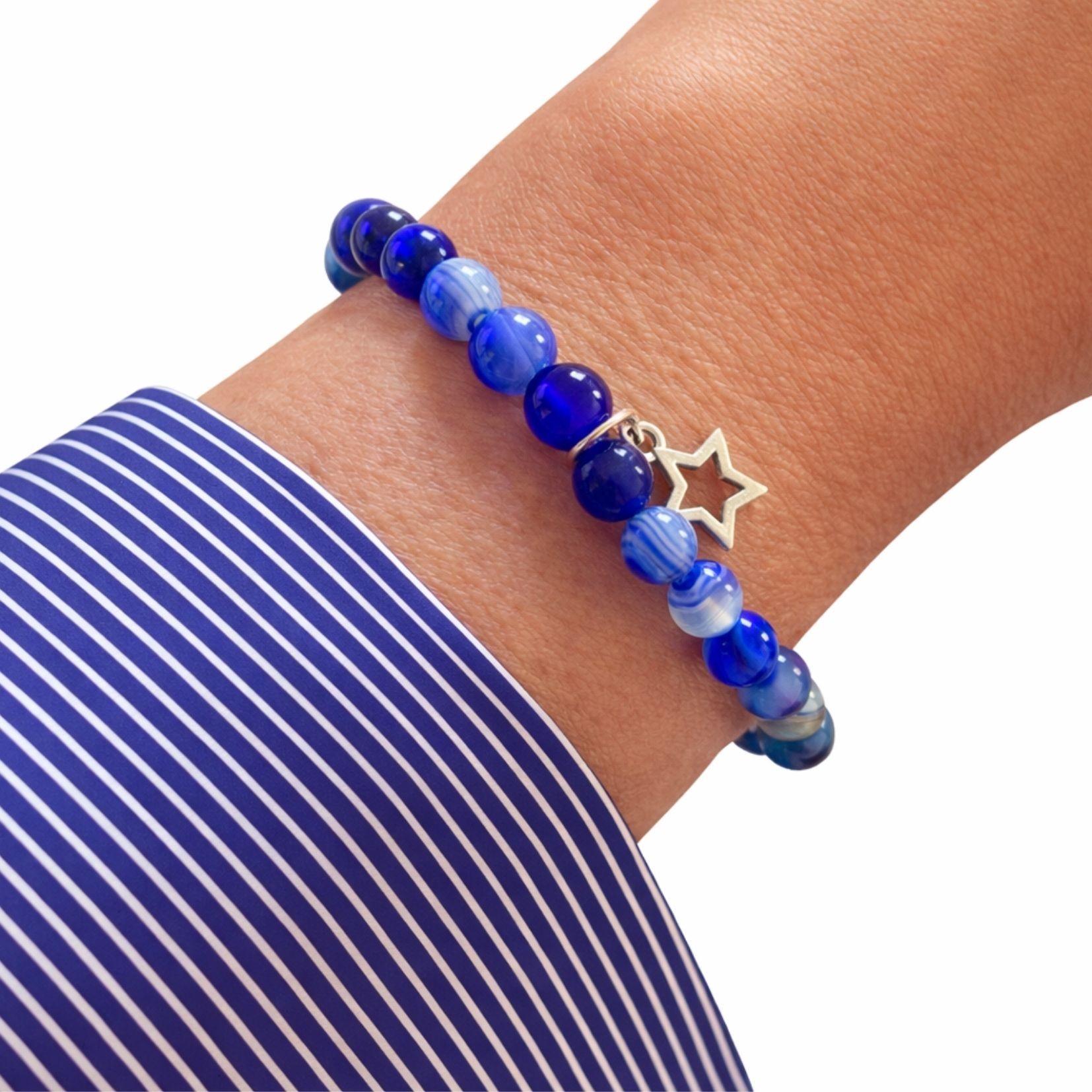 Au centre du bracelet, une breloque étoile argentée apporte une note délicate et symbolique. L’étoile est souvent associée à l’espoir, aux rêves et à la guidance.
