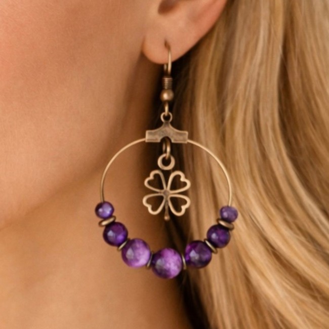 Les perles aux tons violets et prune apportent intensité et caractère au bijou. Montées sur un cercle fin en métal bronze, elles créent une composition harmonieuse et lumineuse. Au centre, un petit trèfle ajouré apporte une touche symbolique et poétique, évoquant la chance et l’élégance naturelle.
