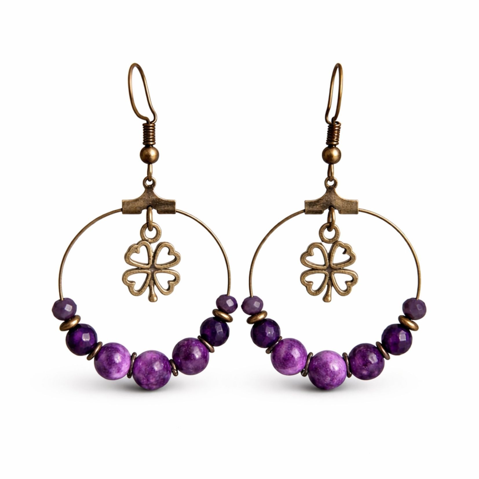 Élégantes et originales, ces boucles d’oreilles artisanales associent de magnifiques perles agate violettes aux nuances profondes à un délicat pendentif trèfle.