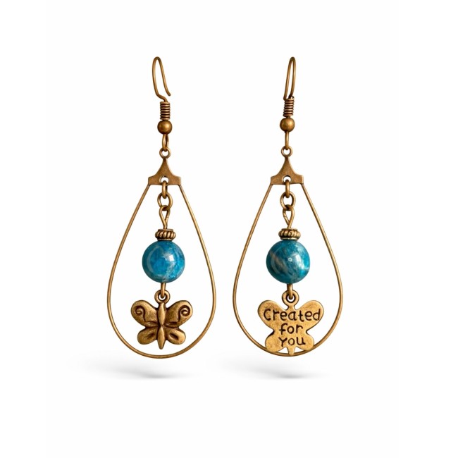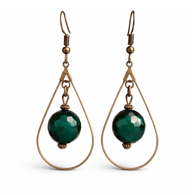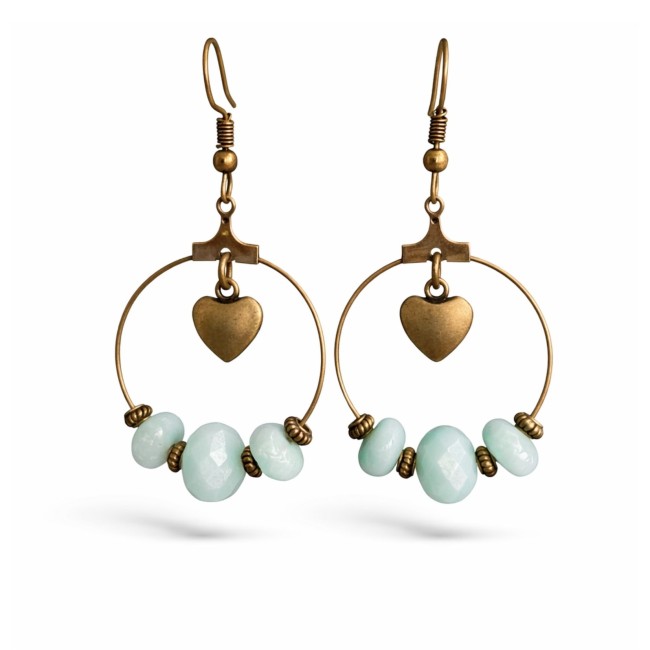 Douces et élégantes, ces boucles d’oreilles artisanales associent de délicates perles vert d’eau à un charmant pendentif cœur bronze.