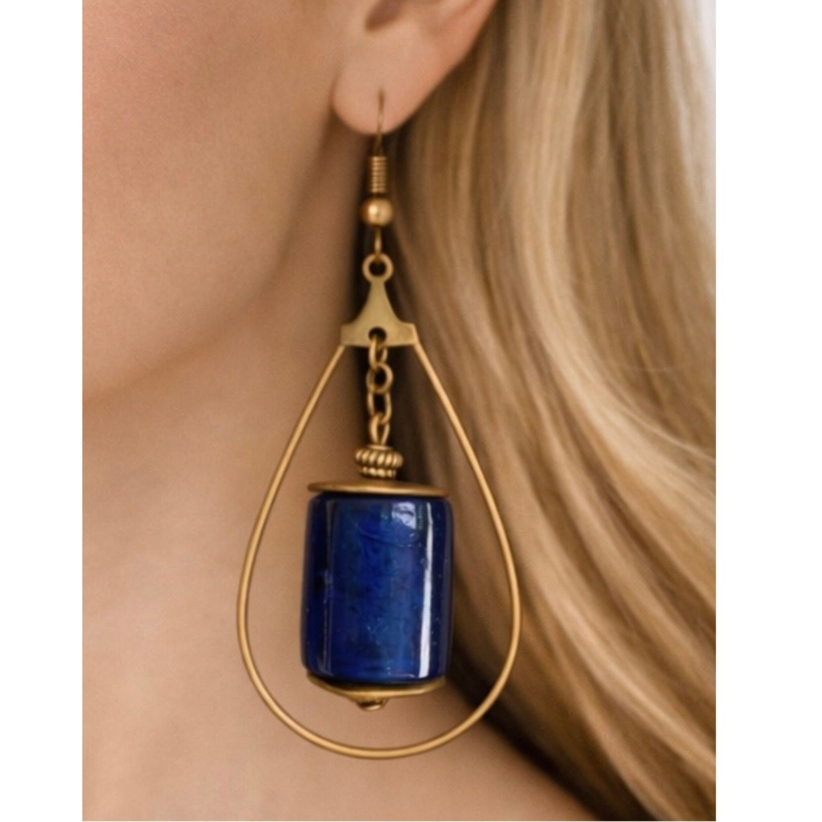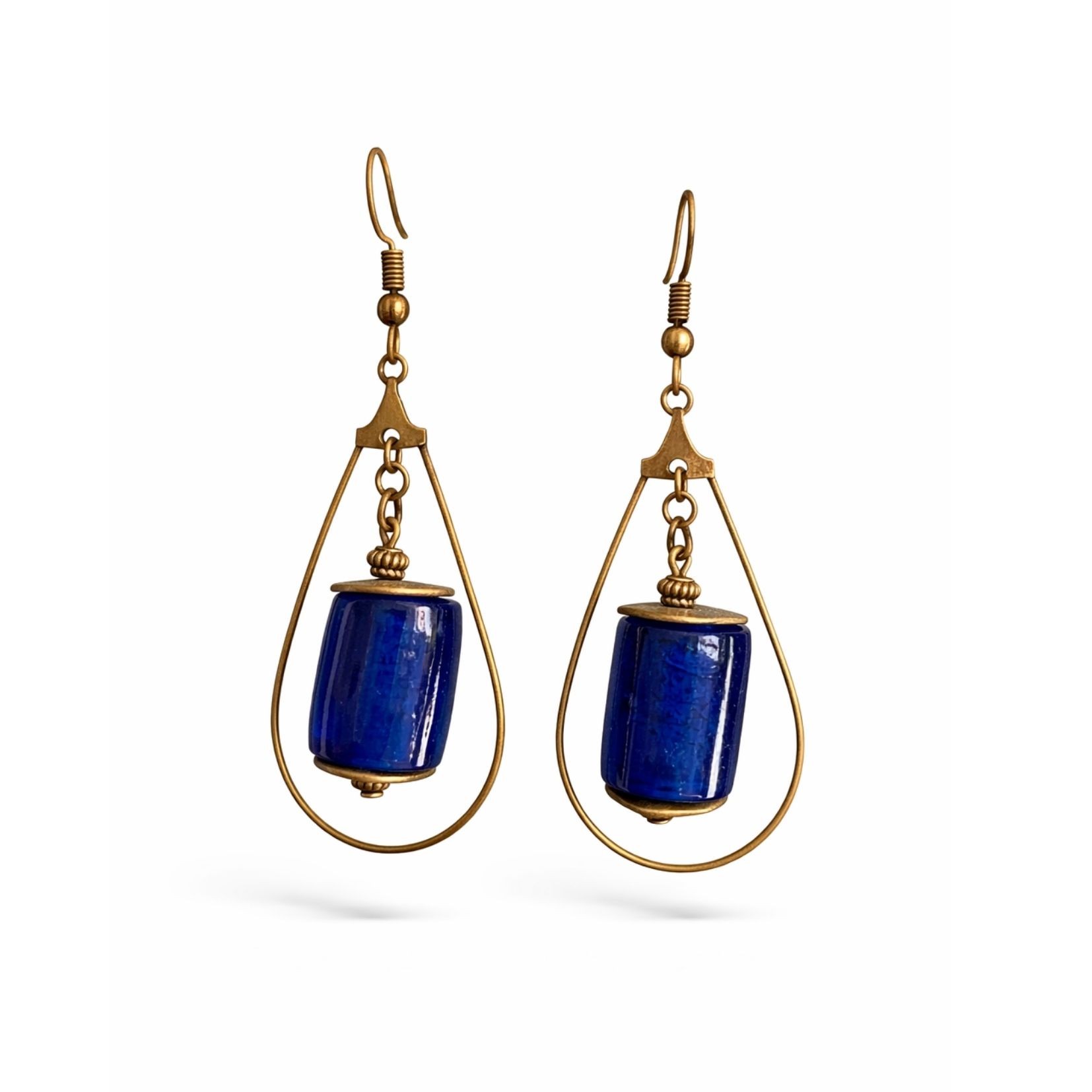 Élégantes et intemporelles, ces boucles d’oreilles artisanales mettent en valeur de magnifiques perles bleues en verre montées dans une fine structure en forme de goutte en métal bronze.