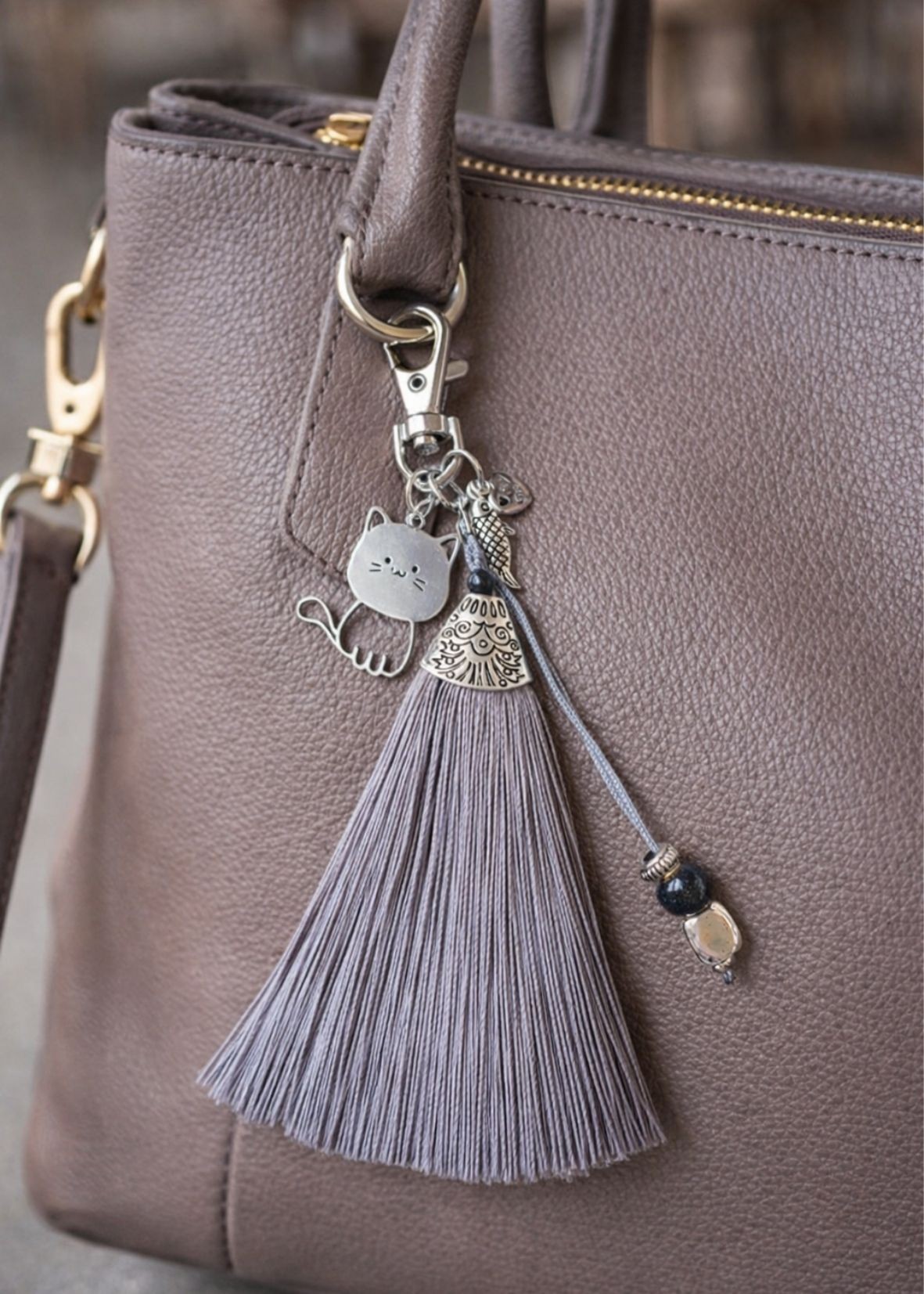 Bijou de sac pompon gris chat