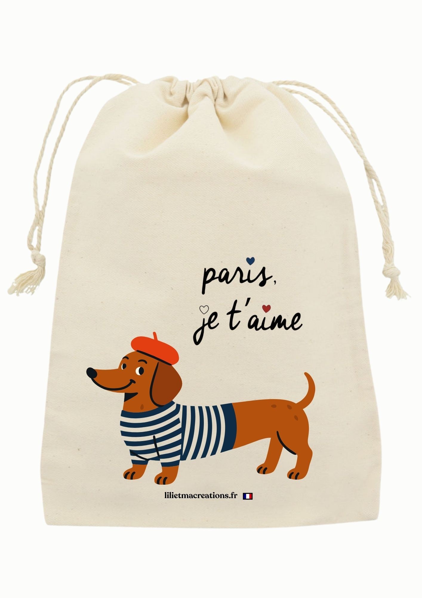 Un pochon en coton biologique recyclé, à la fois pratique, joli et écoresponsable. Avec son adorable motif chien teckel Paris je t'aime, il est parfait pour offrir, ranger ou présenter vos petits trésors avec douceur.