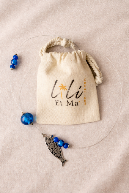 Sautoir ruban satin bleu, poisson dans tube en verre